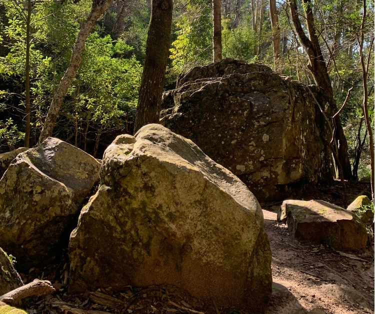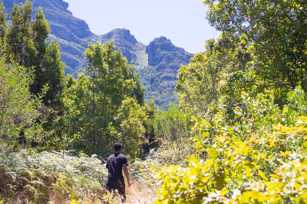 A rocky track winds its way through the forest, passing a stream and winding between mountain fynbos (a small belt of shrub-like vegetation) that is exclusive to South Africa and various unique rock formations.