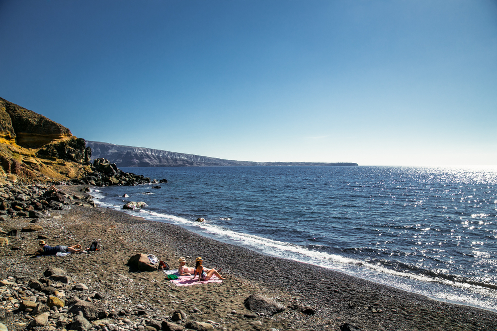 It is definitely not a place you want to go with children because it is a nudist beach. You should keep this in mind when you visit. You can take a taxi from Fira to get here, but it might be a bit expensive because it is far away. There are no local buses that run to this beach. You can sunbathe, relax, and read a book, but just remember the interesting “conditions” of this beach. Clothing is optional.