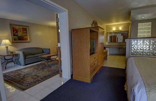 Indulge in the epitome of comfort at our Deluxe Room Oasis. Each room is thoughtfully designed with modern amenities, including a stainless steel mini refrigerator, microwave, coffee maker, and a full bath with a tub, shower, and granite vanity. Enjoy entertainment on a flat-screen smart TV, stay connected with free WiFi, and take advantage of our business center and fitness center. Dive into relaxation in our tropical pool.
