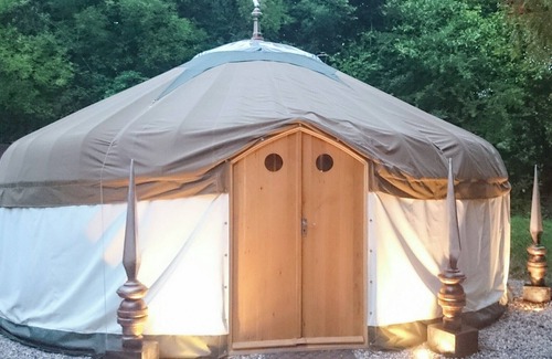 Elodie Yurt offers a quirky and rustic glamping experience in South Devon with actual set elements from the Gladiator film. Perfectly suited to a couple searching for a unique stay.. 1 step to entrance.