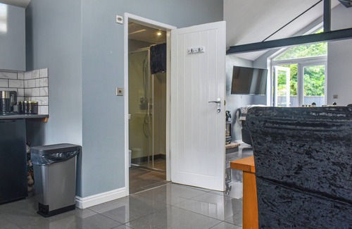 Shower Room: Cubicle Shower, Heated Towel Rail, Toilet. Electric central heating, electricity, bed linen, towels, Wi-Fi and fuel for wood burner included. Welcome pack and doggy extras. Enclosed back garden with patio and garden furniture. On road parking. No smoking.. Tucked away in a beautifully converted garage, this stylish studio-style holiday let is the perfect countryside escape for couples, and one well-behaved furry friend.