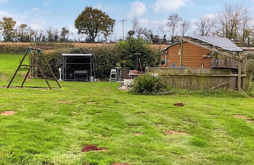 Shower Room: Cubicle Shower, Toilet. Partial, Electric central heating, electricity, bed linen, towels and Wi-Fi included. Welcome pack. Games room (shared with other properties on-site). Front garden with sitting-out area, firepit, garden furniture and barbecue. Grounds with sitting-out area, firepit and barbecue. Children’s play area (shared with other properties on-site). Hot tub for 6 (private). Private parking for 2 cars. No smoking.. Nestled in the picturesque landscape of Raglan, this charming shepherd’s hut with private wood fired hot tub offers a cosy retreat for your getaway.