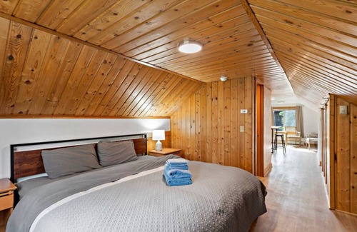 Conveniently located just minutes from the airport, our quaint attic space offers a cozy retreat in Anchorage. Featuring charming original wood paneling, this efficient unit includes a kitchen with a small range, fridge, toaster, coffee maker, and microwave. Enjoy a full bathroom and a comfortable king-size bed. On-site credit card-operated laundry adds extra convenience. Please note, access to the unit requires climbing a staircase with approximately 10 steps.