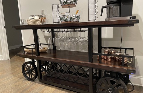 The center space of the home, our chef's kitchen, is fully equipped with high-end appliances and all the essentials for creating gourmet meals. Dining is a grand affair with a large farmhouse-style table seating 18, an intimate 4-top in the breakfast room, and an additional 6-person dining table in the living room.