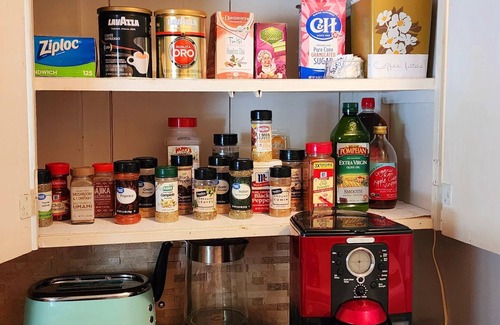 • Kitchen & Cooking: Refrigerator, freezer, microwave, oven, stove, toaster, kettle, cookware (pots, pans, and oil), dishes and silverware (bowls, chopsticks, plates, cups, wine glasses), and coffee maker (with coffee)
