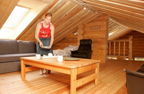 Unique log cabin with stunning environment on a large natural plot. Here you can leisurely enjoy the silence and observe pheasants and hares running around. There is a bathroom with whirlpool/shower as well as a guest toilet. The house has exciting furnishings with high-vaulted ceiling which gives a special space. Spacious kitchen/dining area with access to large terrace which surrounds the house. The living room has a cosy TV area where the dish provides all kinds of TV programs. Stairs to the mezzanine which is decorated beds and a children's playroom.