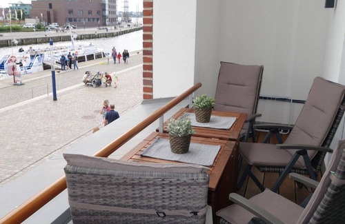 The balcony is accessible from the living room and you have a fantastic view of the harbor and the old town of Wismar.