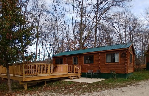 Come enjoy a real log cabin experience in the quiet hills of Hocking Hills/Lake Logan. Inside the beautifully wood furnished cabin you will enjoy a living area with a futon and TV, a full kitchen, and a full bathroom. They feature a private room with a queen bed, private room with a full bed and a futon in the living area for additional guests. Cabin is equipped with one TV & a DVD player which are centrally located in the main living area. Air-conditioning and heat keep the cabin comfortable in all seasons. Your outdoor living space includes a concrete patio or deck, including seating. Every cabin has its own charcoal grill, picnic table, and fire pit area. A parking pad is provided in front of the cabin. All campground amenities are available with registration. Young children are free, so please do not include children 2 and under in your reservation count.