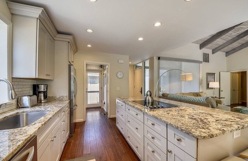 As you enter this property, you are greeted by the beautiful fully equipped kitchen with all stainless steel appliances. With an island in the middle, there’s tons of counter space and two bar seats to watch the action in the kitchen! Just to your left you’ll find seating for four at a dining room table. Opening up from the kitchen is a gorgeous bright living space with a large couch and two arm-chair’s for additional seating. The vaulted ceiling, sliding door windows, and beautiful blue and gray color scheme create a tranquil and airy room, perfect for spending quality time with your family.