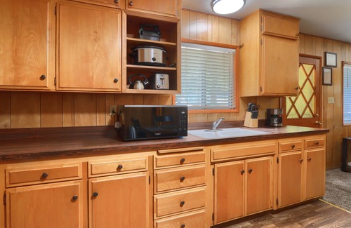 The Redwoods cabin is a quaint, 2-bedroom, 1-bathroom home that sleeps up to 6 guests. The kitchen is fully equipped with everything you need for cooking and dining. In the living room, there is a wood stove (firewood provided in season), satellite TV, and WiFi. The deck with its picnic table and gas BBQ is perfect for outdoor grilling and dining. Just off the deck, there is a small wooden bridge over a seasonal stream, which leads to a beautiful open meadow and forested area. There is also a natural, small clearing surrounded by trees and rocks, which is the perfect spot for hosting a small outdoor wedding or reception. Does not have Air Conditioning. No Pets allowed.