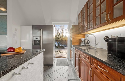 For those who love to cook, the kitchen is equipped with all the necessary appliances, including a microwave, oven, ceramic hob, dishwasher and a wine fridge, so you can store your favourite wines. There is also an 80-litre freezer, allowing you to store food for your entire stay. The open dining area and living room with wood-burning stove create a cosy atmosphere, perfect for gathering around meals or playing board games in the evening.