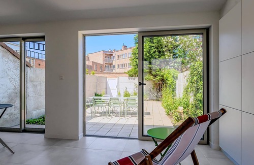 Beautifully renovated house close to De Panne market . Nice open kitchen with living room connected and veranda overlooking terrace .