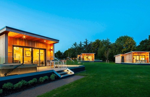The bespoke luxury Studio Lodge Plus is perfectly positioned at the front of the Glamping area, providing uninterrupted countryside views in a stunning scenic location and greater privacy throughout your stay, combined with offering accommodation for up to 5 people. Modern open plan lounge/kitchenette and dining area incorporating main bedroom, with separate bunk bedroom. Additional sleeping for one in the lounge area with corner L shaped sofa bed and storage footstool. Kitchenette features quality SMEG appliances including combination microwave/oven, two ring induction hob and under-counter fridge with freezer compartment. Complementing the luxurious fixtures and fittings, the Studio Lodge is fully insulated together with underfloor heating and stylish modern fireplace, with 4K Smart TV. Fully fitted bathroom with walk-in shower (complimentary soap and shampoo), towels and Dyson hairdryer, and glass balustrade balcony featuring large Jacuzzi hot tub and patio with garden furniture too. Studio Lodge Plus also have a separate heated storage room for use with any coats, bikes, golf equipment or luggage. Sorry but no pets allowed in Studio Lodge Plus (please see Safari Tent Plus). . When it comes to outstanding accommodation and five-star leisure facilities, look no further than Plassey Holiday Park, Retail Village and Golf Course. Nestled in 250 acres of park and woodland in the picturesque Dee Valley, North Wales, this multi award winning luxury holiday park is more than just somewhere to stay.