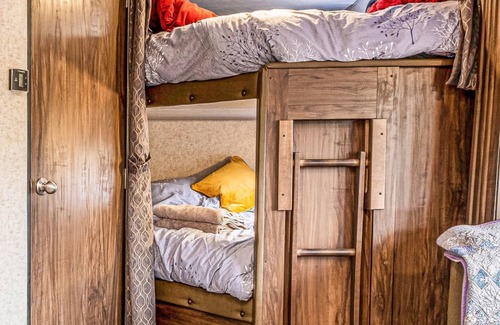 Bathroom: With shower over bath, and toilet.. Have you ever imagined staying in an American RV? Now is the opportunity to do so, BOB is an American RV with an open plan living space comprising of kitchen with gas hob, fridge freezer and microwave, living area with smart TV a double sofa bed and the dining table converts into a double, two double bunkbeds and a kingsize bedroom with kingsize bed, bathroom with shower over bath. Parking for 2 cars on site, private enclosed garden with an outside doggy shower, beer fridge and BBQ and automatic awning - great for sitting under in the summer with something cool to drink and watching the night skies. Lockable bike storage/sports equipment storage. There is a large, enclosed paddock on site for exercising your four-legged friends, there is also a communal area – the Hoop barn which has a BBQ and seating area. Utility area with washing machine and two tumble dryers and toilet. Wood for the log burner is supplied for the first night then can be bought on site, there are hens on-site; and eggs are able to be purchased. Beach 23 miles.