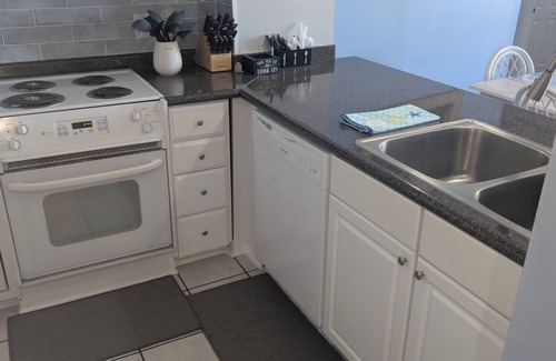 An apartment sized stackable washer and dryer are located across from the kitchen. The following items are provided to help you jump start your vacation: Dishwasher pods (2), laundry pods (2), soap in each bathroom, bath tissue (2 rolls for each bathroom), paper towels (1 roll), trash bags (2), and dish detergent (1). Please ONLY flush toilet paper in toilets. DO NOT FLUSH SAND, BABY WIPES, PAPER TOWELS, FEMININE PRODUCTS, etc.
