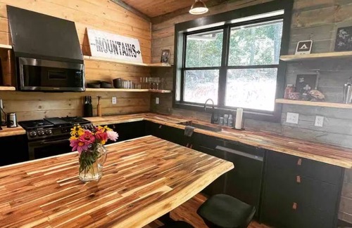 The lower cabin is original to the property and built in 1940, it was purchased from the original family and renovated in March of 2021. The cabin now boasts a vaulted ceiling in the comfortable, cozy living area that is open to the newly equipped kitchen complete with brand new appliances. The space comfortably sleeps 6 adults or 4 adults and 3 kids with two king bedrooms and a queen over queen bunk room. The main attraction of the lower cabin is the outdoor area that takes full advantage of the amazing mountain setting within Black Rock State Park. The walk out back yard is equipped with an extra large hot tub, outdoor shower, fire pit, dart board and grilling area (with pass through window to kitchen) all with incredible mountain views.
