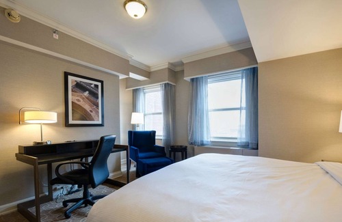 Elegance abounds in the 1 King Bed Junior Suite, which blends modern design with a historic touch. A sofabed and wingback chair with ottoman adorn the living room, which also includes a large desk nestled between the windows. Open the French doors to reveal a stately bedroom featuring a King-sized bed framed by an upholstered headboard. The well-appointed bathroom includes Crabtree and Evelyn products for a refreshing start to the day. This one-bedroom suite in Milwaukee is perfect for guests seeking separate living and sleeping spaces. Just outside of beautiful Lake Michigan, centrally located in the Downtown Milwaukee Financial District sits the hotel. Guest can enjoy the comfort and convenience of this historic hotel; with four on-site restaurants, a 24-hour fitness and business center, 30,000 square feet of meeting space to plan your next event and just minutes away from the popular Summerfest grounds, this downtown hotel puts its guests in the center of it all. Near the Milwaukee River Walk and the Harley Davidson Museum, this hotel is the perfect location to explore local breweries, art galleries, antique shops, and other noteworthy attractions.