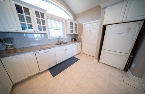 On the ground level of the home is our family rec. room. This secondary living space offers a large, HDTV with Blu-Ray DVD player, Wii game system, boardgames and puzzles. A full bathroom with tub/shower and a Twin over Full bunk bed turn this space from a spacious kids' suite into a 5th bedroom. Sliding glass doors open onto a covered, ground level deck space with beach boardwalk just outside the door or to the enclosed hot/cold outdoor shower with foot-washing station, fish cleaning sink and gas grill.