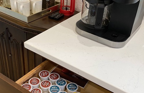 Thank you for choosing the Tetris House. Named for a popular video game (see our floor plan), the Tetris House is an upscale couple’s sanctuary with private hot tub, designed to offer maximum style and comfort. Our modern mountain cabin has one king-sized bedroom, adjacent to a luxurious main bathroom and dressing area. The beautiful open concept living, dining and kitchen area opens to a 35-foot long deck overlooking a pond. Our best hidden feature: the HEATED TILE FLOOR throughout.