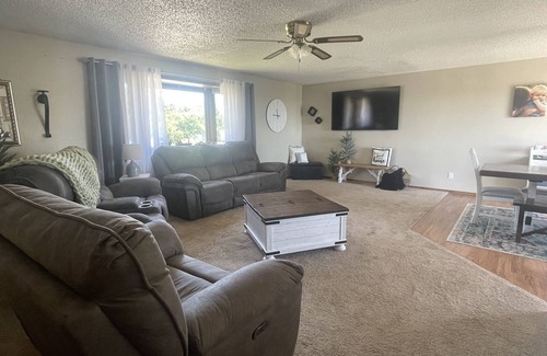 Large living room upstairs with 5 recliners and a 70” 4K Smart TV. There’s a spacious living room downstairs. 3 bedrooms with queen sized beds in all and linens provided. 2 of the bedrooms have smart TV’s. 2 Full bathrooms with towels and soap provided. HUGE driveway for bike trailers/ bigger vehicles and oversized 2 stall garage for bike storage. There’s a big deck right off the dining room with seating and a smoker available! There’s a in ground firepit in the backyard. House sleeps 6 comfortably but can sleep up to 8 with a queen sized air mattress in living room (provided). Fully stocked kitchen utensils, air fryer, coffee maker and cookware for your dining needs.