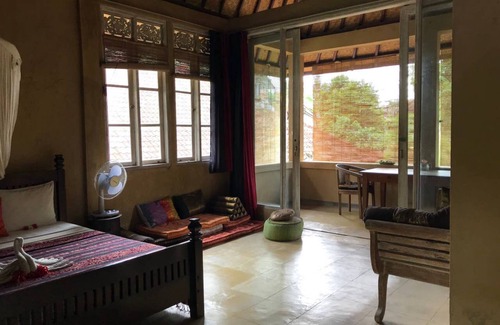 Our apartment is on the compound of a guesthouse and you get to the apartment through the reception of the guesthouse. In the garden, next to the entrance of the top apartment of the villa, is an iron gate with 'Villa Cinta' on it: behind it are the steps to the apartment and the house 'downstairs'. The house consists of many interior detailed Balinese furnishings, organic lime walls, antique doors and huge windows. Pleasant, open spaces, colorful pillows, fan, mosaic tiled bathroom, hot water, western style toilet, a kitchen area with a fridge downstairs. Free WiFi available around the house.