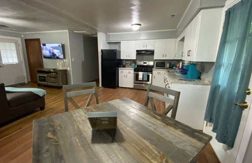 The Creek is a peaceful and cozy 3 bedroom, 1 bathroom getaway nestled in the woods alongside a beautiful trout creek, which you can fish from the property or from the nearby creek access point. Steps away from The Creek is a ball park where the kids can run and play, play baseball or fish. There is also a 1 mile walking path around the park. You don't even have to get in the car to go to the park!