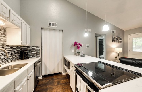 Luxury 1BD/1BA 2nd-floor condo near Baylor Med. CTR! Located in a gated community with a charming French theme. Amenities include workspace, in-unit washer/dryer, pool, patio, & fenced yard. With easy access to HWY 161 & 183 & nearby attractions like Towne Lake Park & West Irving Aquatic Center, it’s ideal for professionals or couples on extended stays. offering a versatile living/working area