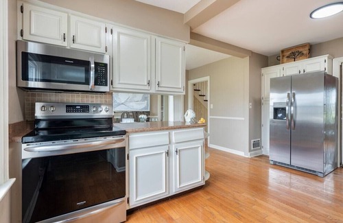 This 2 story colonial home has a large primary suite with a king bed and 2 sofa beds in living rooms and a trundle bed on main floor. 3 bedrooms 1 full bath (w/ claw foot tub and rain head shower) housing 4 beds upstairs. Primary suite includes Dressing room, and full bath with walk in shower and separate tub/shower combo plus Stack laundry. Small half bath down stairs to service guests.
