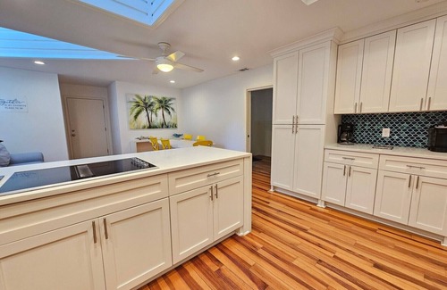 The fully-equipped kitchen is to the right as you enter and is very open with several skylights. It features a breakfast bar that seats three and an eat-in kitchen table that seats four with access to the back deck. There is also a sleeper sofa in this room that can be used for additional guests.