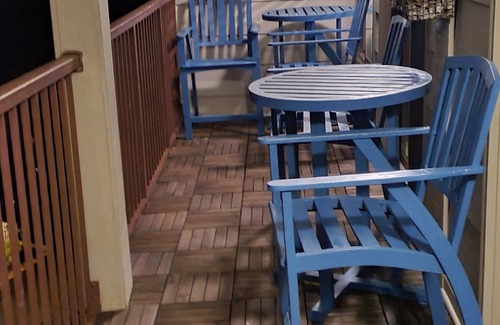 The balcony has beautiful wood flooring and two high-top tables with two chairs each. The tables sit up high enough for you to see the beautiful view over the balcony railing.