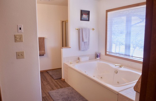 Our house is located on 2 acres in a golf course community on a plateau 1,000 feet above Ridgway, Colorado. The house has 3 full bedrooms and 3 full bathrooms. The upstairs consists of the kitchen, family room, dining area, master bedroom and master bath. The downstairs has 2 bedrooms with 2 beds each and 2 full bathrooms.
