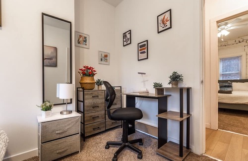 Step inside this tastefully decorated haven, meticulously furnished for your relaxation. Sink into plush sofas while enjoying your favorite shows on the flat-screen TV or brew a cup of coffee using the Keurig machine, stocked with complimentary pods. The fully equipped kitchen, boasting sleek quartz countertops and stainless steel appliances, caters to both culinary enthusiasts and those seeking simple meal heating options. Each of the three bedrooms offers cozy beds and ample storage space for your belongings, ensuring a serene night's sleep after a day exploring the city. The clean, well-appointed bathroom provides fresh towels and essentials for a convenient stay.