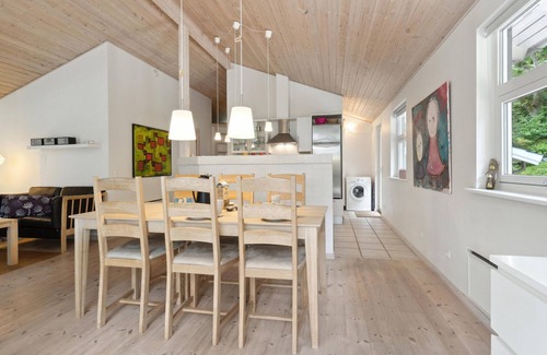 Nice cottage in a beautiful natural area, it is located on a large child-friendly property. The interior is practical and inviting. From the living room you come out onto the terrace, which offers a view of the surroundings. Part of the terrace is under roof and is therefore very suitable for evening barbecues. Not far away is the beautiful sandy beach of Øster Hurup, as well as Randers with the Regnskov complex, good stores and restaurants. On the nearest coast is a beach meadow. As the nearest sandy beach we can recommend the bathing beach at Øster Hurup.