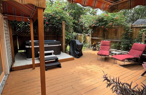 3- Bedroom, 2- Full Bathroom, Cozy Cottage on a quiet street with a great fenced in backyard, gas grill and parking for up to 3 vehicles. . Large wood deck with flowers, picnic table and umbrella with lounge chairs and a Hot tub too.