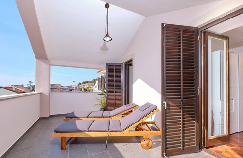 Look forward to your vacation in this two-storey apartment, which welcomes you with an extremely spacious room concept and tasteful and modern furnishings. Staying in this beautiful apartment is like relaxing in a little oasis of peace. The charm of the living rooms with spiral staircase, tiled stove and loving decoration, as well as the balconies, offer you great corners and areas to retreat and sit together in convivial company and enjoy the breathtaking view of the sea and the town of Mali Losinj. Relax on the sun loungers on the terrace and round off the evening with a barbecue.