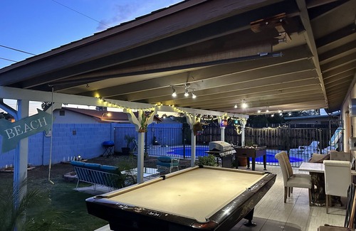 Nestled in the heart of North Mountain, Phoenix, this 3-bedroom vacation home offers a delightful escape for travelers. As you step inside, you'll be greeted by a fully stocked kitchen, complete with an oven, refrigerator, grill, and all the necessary appliances and utensils to whip up delectable meals. Unwind in the cozy living room or challenge your friends to a game of pool or chess. When it's time to relax, retreat to the outdoor oasis, where you can lounge by the sparkling pool, gather around the fire pit, or simply soak up the sun on the comfortable beach loungers. Explore the nearby attractions, such as the Desert Diamond Casino,Grand Canyon University, Westgate Entertainment District, and Chase Field, all within a short drive. With free Wi-Fi, a smart TV, and a washer and dryer, you'll have all the comforts of home during your stay. Whether you're seeking a family getaway or a weekend with friends, this vacation home promises an unforgettable experience.