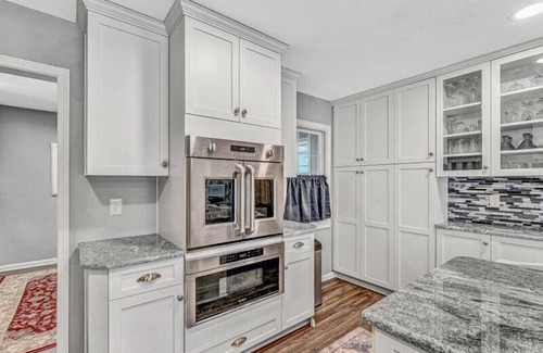 The fully equipped kitchen boasts beautiful granite countertops and gas cooktop, perfect for preparing meals. A lakeside deck spans the width of the house, offering great water views.