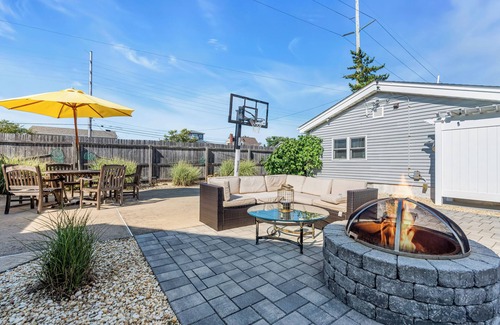 Outdoor shower. Fully fenced in backyard with fire pit and grill, sit back and relax after a day at the beach or boardwalk.