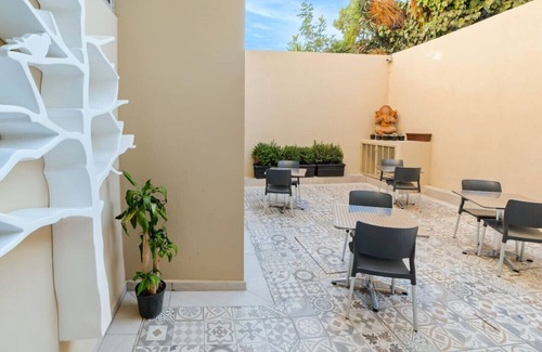 Your Studio is located on the third floor. On the ground floor there's a quiet and large community patio. A second patio is next to our front desk