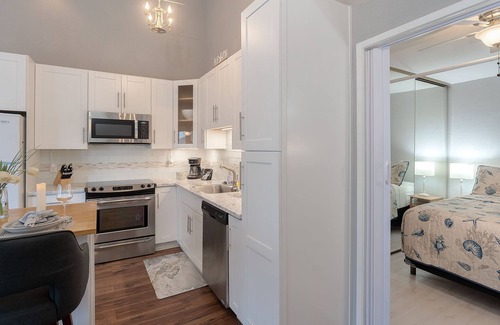 The recently remodeled kitchen is well-equipped so you can stay in and enjoy meals from your cozy retreat. Well-equipped for extended stays!