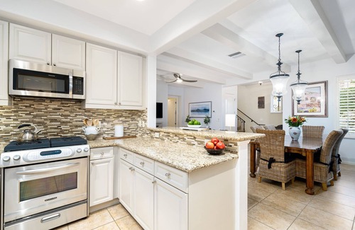 KITCHEN: Fully equipped kitchen with gas stove, stainless steel appliances, and cookware. Solid Granite Kitchen countertops throughout. Refrigerator with Ice Dispenser and Filtered Water. Dishwasher. Toaster. Microwave. Coffee Maker. Blender. In-sink Garbage Disposal.