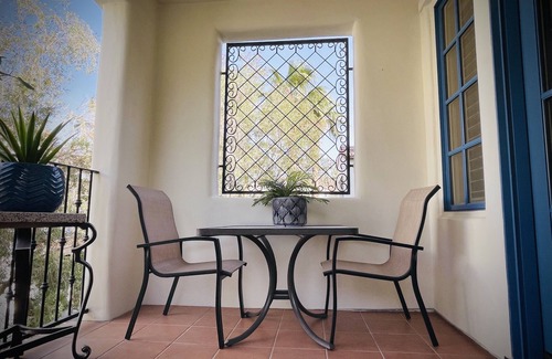 The flexcation-friendly King Suite features a bedside desk, as well as semi-private balcony with two bistro tables if you prefer to plug-in your laptops outside. Or just enjoy your coffee in the fresh morning air while listening to the babbling-brook echoes of the triptych fountain to the south.