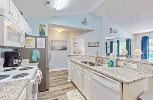 This 2 bedroom condo boasts a coastal-themed open floor plan that seamlessly combines all living spaces into one. The living room invites you to spread out comfortably and relax as you stream a favorite movie, show, or sports game on the smart TV. The well-appointed kitchen has all the essentials to prepare delicious homemade meals for the group and also includes a dishwasher for quick and easy post-meal cleanups. And if you are a coffee enthusiast, you'll be happy to know there is a Keurig coffee maker available. The gorgeous living room opens onto a deck with impressive views of the nearby golf course and pond and an outdoor dining area. The main bedroom enjoys a smart TV, access to the deck, and an en suite bath. Additional perks include a washer/dryer and central AC.