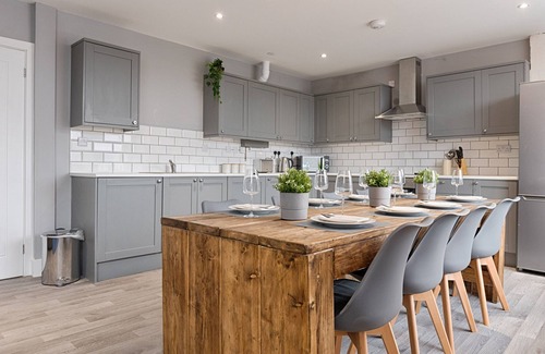 Open-Plan Living Area: Features a cosy corner sofa, a fully equipped kitchen with a dishwasher and large fridge/freezer, and a dining table that seats 10—perfect for group meals or socialising.