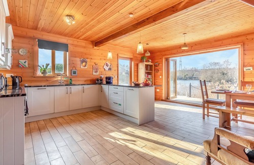 The third and fourth bedrooms both have three single beds making them suitable for children or adults sharing. On the first floor is also a spacious family bathroom. The open-plan living and dining area features expansive bi-fold doors that seamlessly blend indoor and outdoor spaces, allowing natural light to flood the interiors and offering panoramic lake views. For added comfort during cooler months, a log burner in the living room ensures a warm ambience. There is a well-equipped spacious kitchen with a coffee machine and breakfast bar seating for four. The separate utility room is handy for washing and drying wet clothing from the lake, making it a convenient addition for those engaging in water activities. A separate games and reading room provides entertainment options with game consoles, board games, and book selection. A downstairs toilet off the games room adds further convenience for guests.