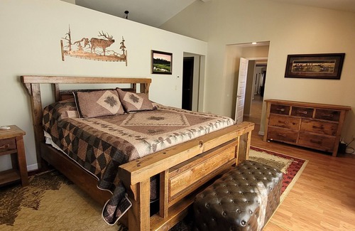 Welcome to the Meeteetse Retreat and the West! This gorgeous 4 bedroom 2.5 bath home is located in Meeteetse, Wyoming , near Cody and Yellowstone. Located right in town on the river this home is perfect for family gatherings or just a trip to our beautiful area. Once you walk in the home you are greeted with tall ceilings and lots of space. The gorgeous dining room is perfect for all your meals, while the living area is large enough to enjoy time together and playing games. Off the living room is a bunk room with multiple sets of bunk beds. Across the living room to the other side you will find a full bathroom with a beautiful step in tile shower as well as another bedroom with a king bed. The large kitchen provides ample space for food prepping and cooking. Off the kitchen and dining room you will find the Master bedroom. This large bedroom with a king bed not only has patio doors, it has an attached bath with a soaking tub and large walk in shower with dual heads. Down the hall from the kitchen is another small room with a bunk bed, a half bath, laundry room, access to the garage and arcade room. Guests can park in the 3 car garage or there is plenty of room outside. Once outside you will find a large backyard area for lawn games and a BBQ. As you continue around the corner you will see a fire pit with outdoor seating over looking the river right off of the arcade room. The arcade room has a fold out Murphy bed, air hockey table and entertainment area as well.
