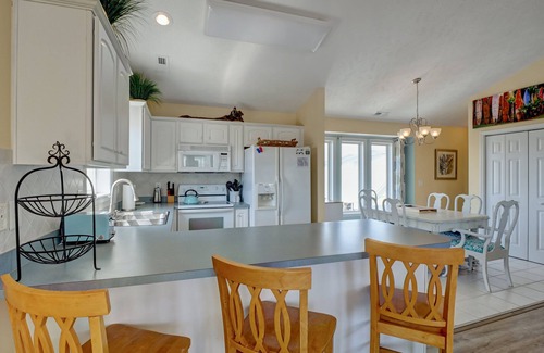 Walk up the stairs to the ‘surf shack’ and you’ll notice the open floor plan is great for gathering multiple generations or several families. The living room offers a smart Flat Screen TV, DVD player, blue tooth speaker, ceiling fans & plenty of space for everyone to stretch out. Additional seating for 3 is found at the kitchen bar along with the additional 3 chairs at the high table next to the beautiful bay window in the living room. There is also a large dining room with seating for 6. This is the perfect area for a meal with a view or for one of the available puzzles or games (provided) on a lazy afternoon. Ample seating throughout this space ensures a relaxing space to spend your time while not on the beach.