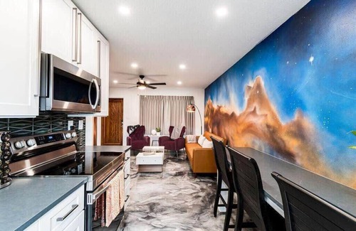 Located on the first floor of our 8-unit "aparthotel," Unit A includes one king bedroom, one queen bedroom, and a modern bathroom with a walk-in shower. Each bedroom provides ample closet space to stow your belongings, while the bathroom includes a vanity with extra storage space in the closet adjacent the door. The common areas offer plenty of sunlight, highlighting beautiful features like chic marble flooring, playful galactic decor, and brand new furniture and appliances including a dishwasher. In the lounge area you'll find a leather couch and and two armchairs to kick back and stream your favorite show on the Smart TV, while the inviting kitchen is fully stocked with a Milky Way breakfast bar providing seating for four. This unit is an ideal landing pad to take advantage of all the area has to offer. Book today to secure your trip!