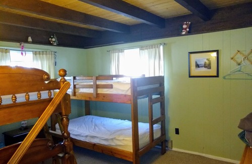 Downstairs (ground level) are Entry/Mudroom, 2 BRs (1 w/ dual bunk beds, 1 w/ trundle bed), Full Bath, 1 LR, and Washer/Dryer.