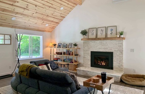 The house is situated directly on a dead end of a county road, which is plowed in the winter. There is no driveway and you may see an occasional car drive by out of the living room window. Our property is about one acre with plenty of space for lawn games and exploration. Dogs must be leashed when exploring the surrounding area and yard (there is no fence). We don't have a hot tub.